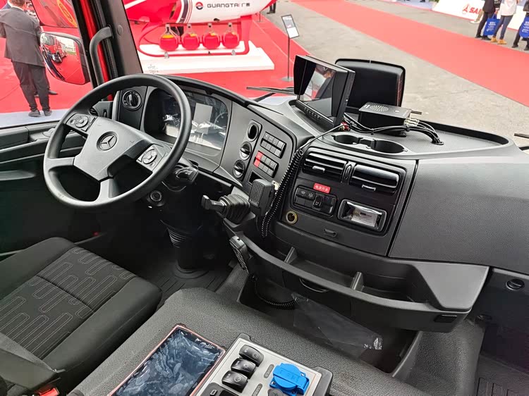 这辆奔驰ATEGO1330消防车采用奔驰全新的第四代ATEGO外观,外形美观时尚,车内风格简约大气。车辆装配了单排驾驶室,驾驶室可乘2人。驾驶室后部还有一个消防员室,设有2排座椅可乘7人。驾驶室采用上灰下黑内饰,美观大气。车上配有多功能座椅、多功能方向盘、机械仪表带液晶显示屏等配置,现代简洁的内饰突出了实用为主的设计理念。