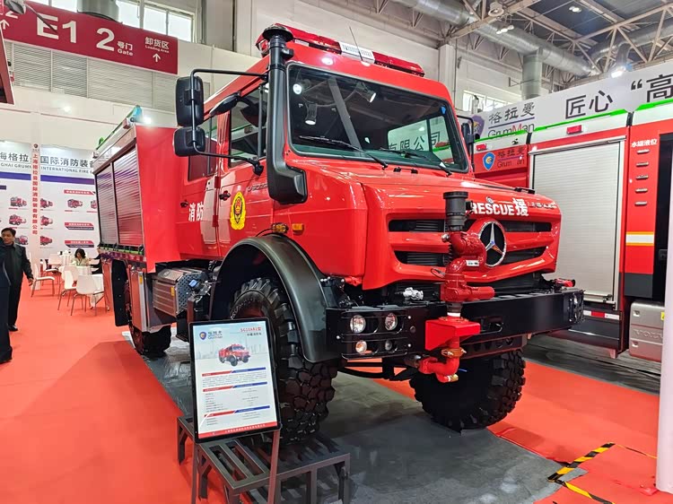 图片上这辆奔驰UNIMOG(乌尼莫克)U5023水罐消防车是展会上的另一位明星,它相比于奔驰ATEGO(阿提戈)更适合在乡村、野外、矿区等地需要越野的地区使用。可靠的四驱系统和高强度钢架结构是该车型的卖点。