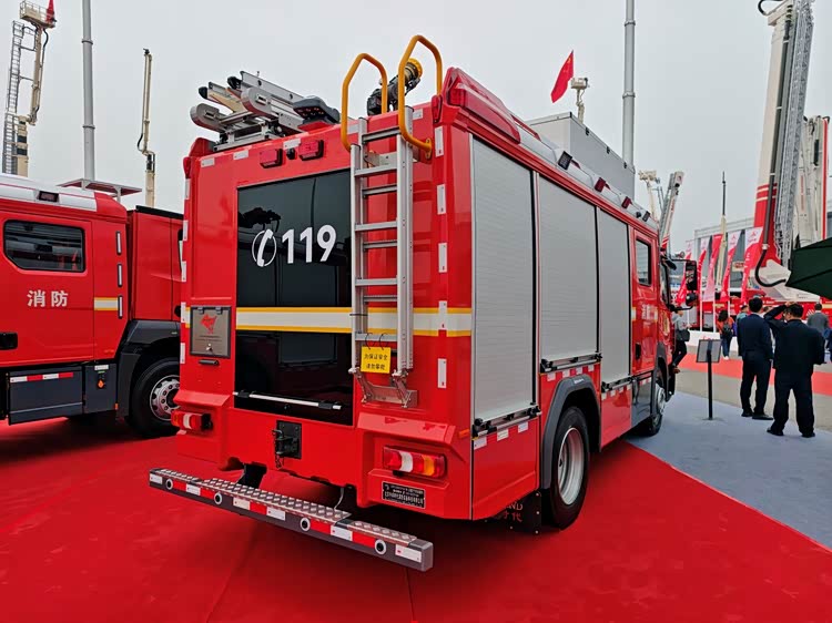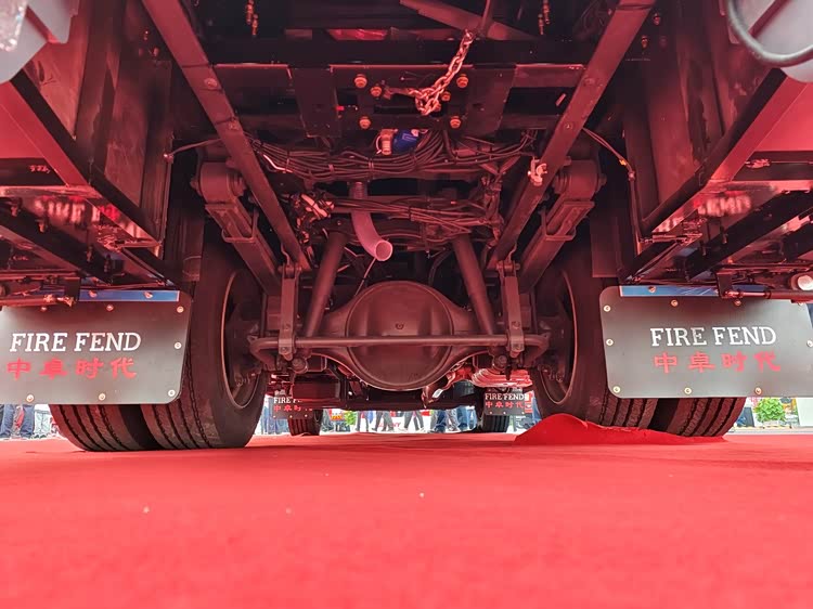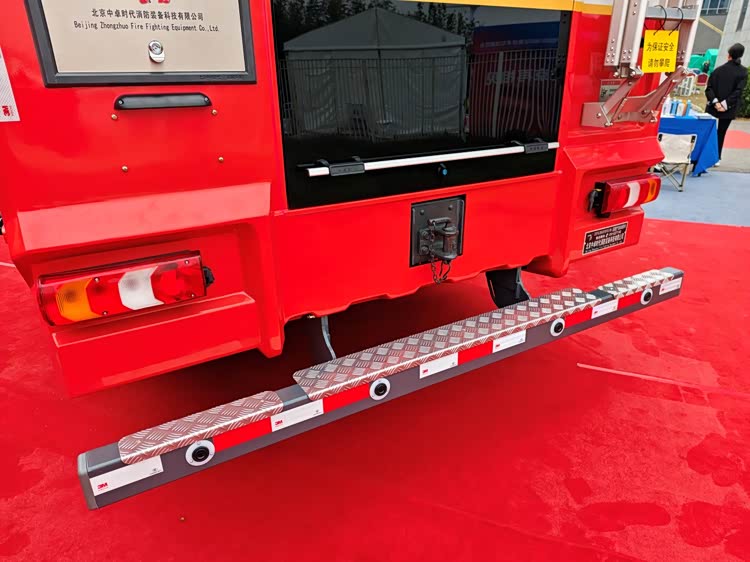 车尾保险杠宽大厚实,设有防滑花纹,不仅防撞,还方便消防员攀登。