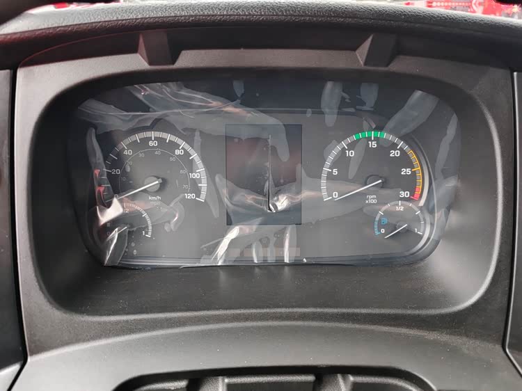 左侧是车速表、油表,右侧是转速表、尿素表,中间是液晶显示屏。