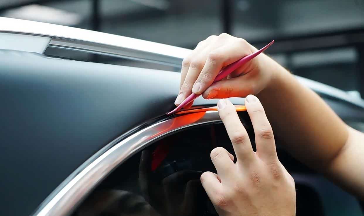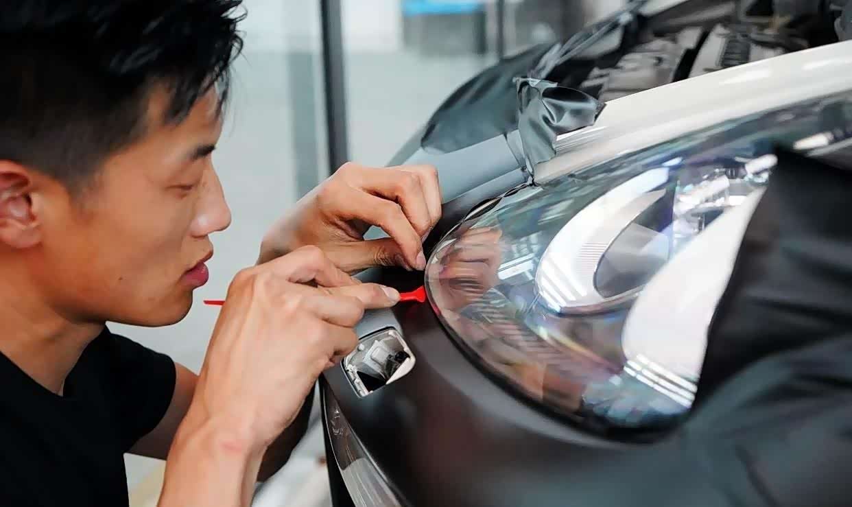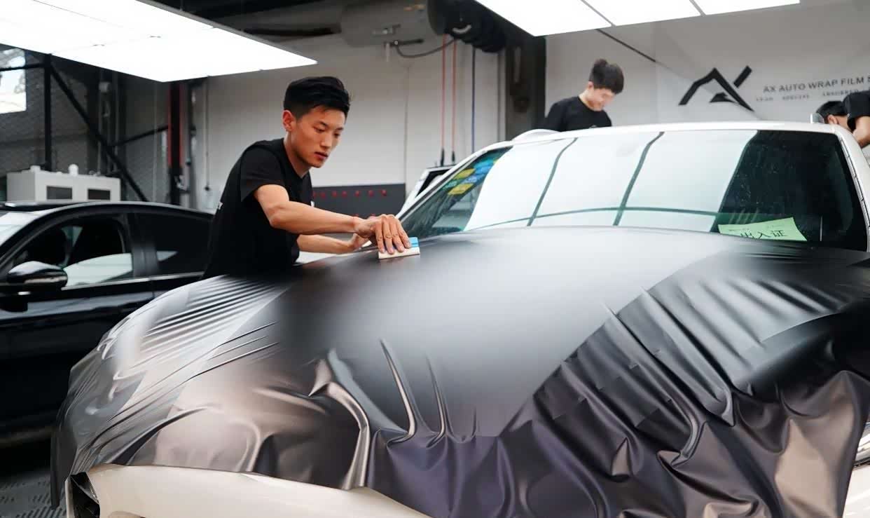不过,车身贴膜可不像手机贴纸那样简单。如何将车膜贴得平整,收边完美,从而展示出最佳效果,这十分考验改色贴膜技师的水平。一个优秀的技师,对刀具使用力度的掌握必须精准到位。如果技术不过关,在收边裁剪过程中,刀刃很容易在车漆表面留下划痕,造成车漆破损。