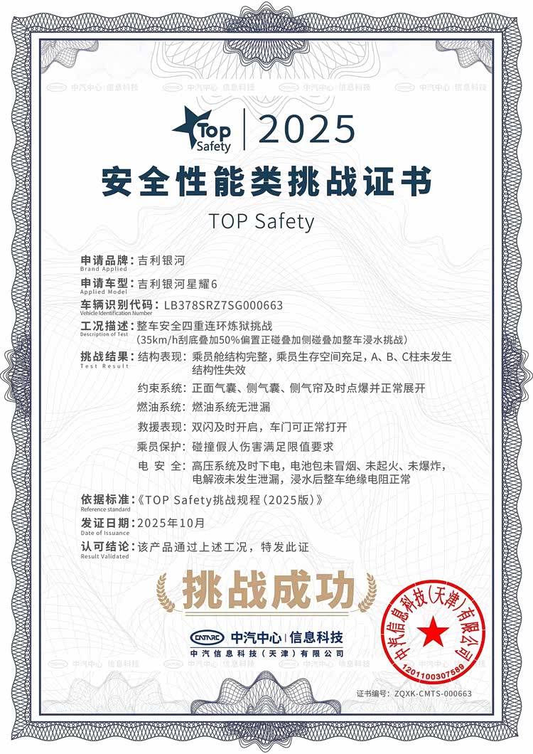 品质方面,吉利银河星耀6通过了中汽研汽车可靠性管理流程认证,等效耐久测试里程超200万公里,覆盖70+种严酷路况;中汽研新能源混动系统最高S级认证,等效耐久50万公里,零故障、零换件、零衰减;GPT整车耐久测试完成400+次循环监测无故障,耐久里程超24万公里;发动机启停耐久试验循环次数80万次,超行业8倍。