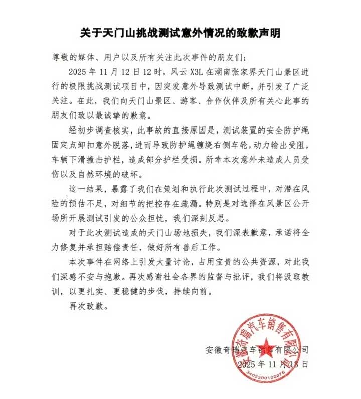 车家号·0浏览·2025-11-13 16:51 · 河北11月12日,奇瑞 风云X3L(参数|询价)挑战张家界天门山999道天梯失利,半程打滑撞护栏的画面引发热议。这款售价仅十万级的家用车,瞄准了曾被路虎揽胜运动版独占的“巅峰成就”,最终却以“出洋相”收尾,让不少人疑惑:家用车为何要去闯“非量产车该去的禁区”?