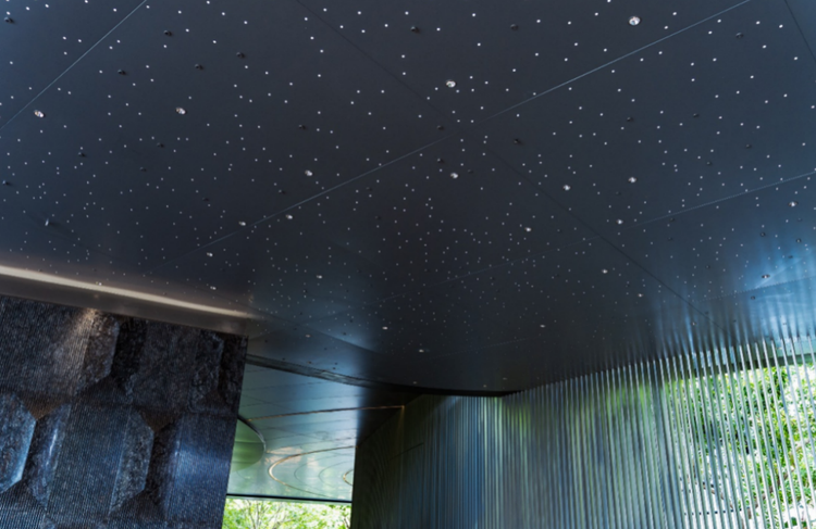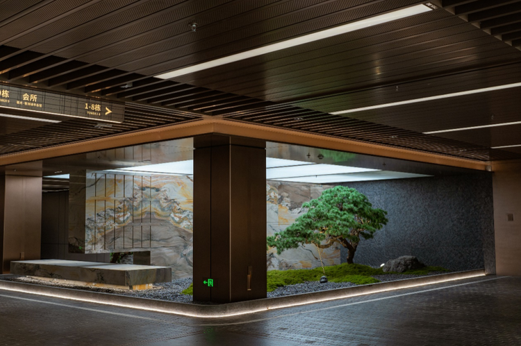 同时,石材本身也成为了建筑美学的一部分,在严丝合缝的工艺与连贯一致的纹理之间,名贵的石材与树木、金属、灯光被构筑成星空、画作,乃至园林的精妙组合,装饰于门厅、连廊甚至于停车场之中。