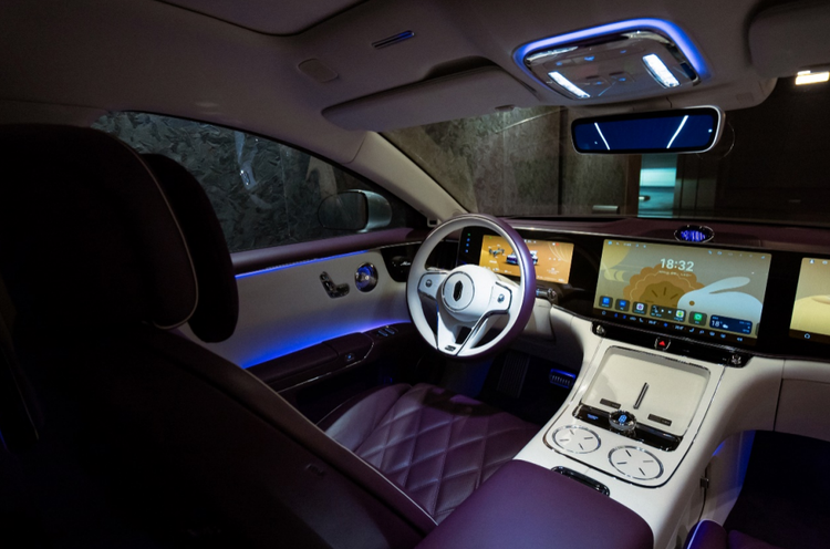 大灯与门把手处的璀璨水晶与闪闪星光透露着科技时代的浪漫,一体环宇三联屏附以76英寸华为临境抬头显示系统,在1680万色氛围灯的点缀下为“车厢氛围”带来数不尽的可能性。