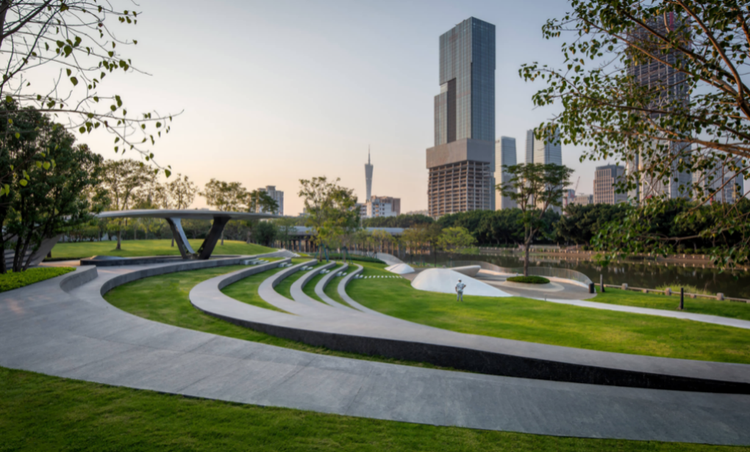 来自马达加斯加的蓝翡翠大理石被制成玉璧般的迎客水景、就连落客岛的地面都以山西黑奢石铺设;像这样来自四海八方的名贵石材,在琶洲南TOD比比皆是。