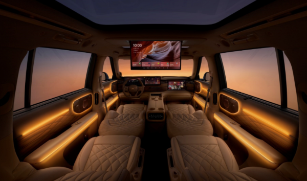 值得一提的是,前排座椅可完全放平,与后排形成 “移动躺椅”,长途出行时能充分缓解疲劳;第二排顶部的吸顶式大屏幕,搭配 3472W B&O 音响与 ERNC 2.0 主动降噪技术,打造出 “图书馆级” 静谧空间,无论是观影还是听音乐,都能获得沉浸式体验。细节上,电子怀挡、环绕式氛围灯、带物理遮阳帘的全景天幕等配置一应俱全,每一处设计都在兼顾实用性与豪华感。