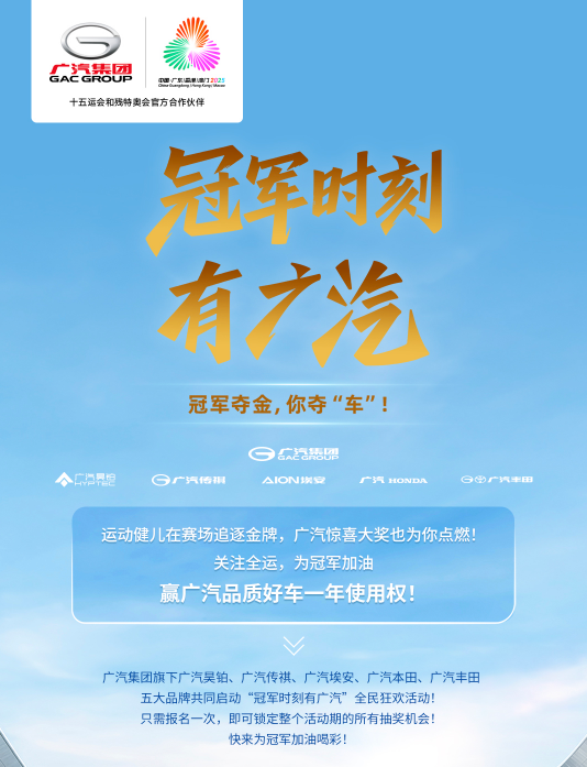 作为本届全运会和残特奥会汽车行业唯一的官方合作伙伴,广汽集团联合旗下五大品牌——广汽昊铂、广汽传祺、广汽埃安、广汽本田、广汽丰田,共同发起了这场名为冠军时刻有广汽的全民互动活动。而它最吸引人的地方,莫过于那份让人心动的奖品清单。