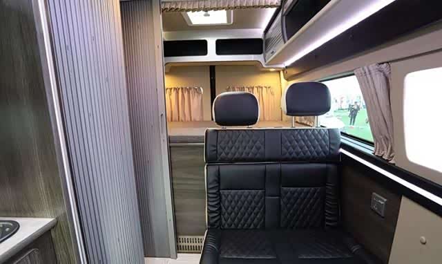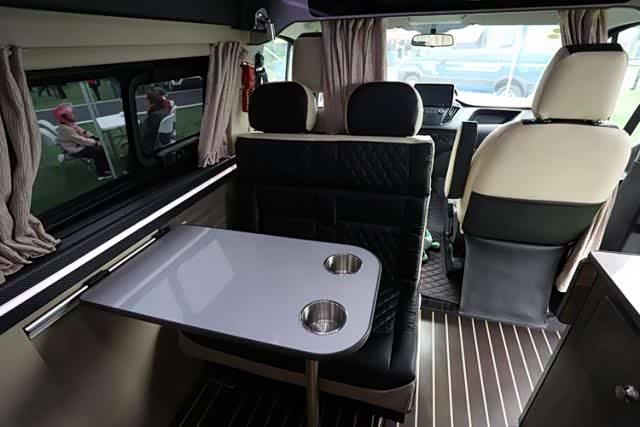 车厢内这款房车设计的非常有创意,驾驶舱与车厢是贯通的,有利于空间的营造。除了主副驾座椅,车厢中间还设计了对排卡座和可升降小桌面。通过对座椅和桌面的组合,这里也可营造出一个可供双人休息的床铺。