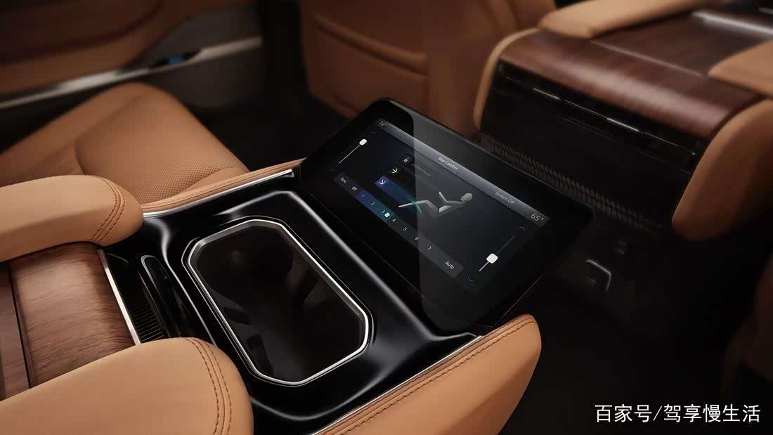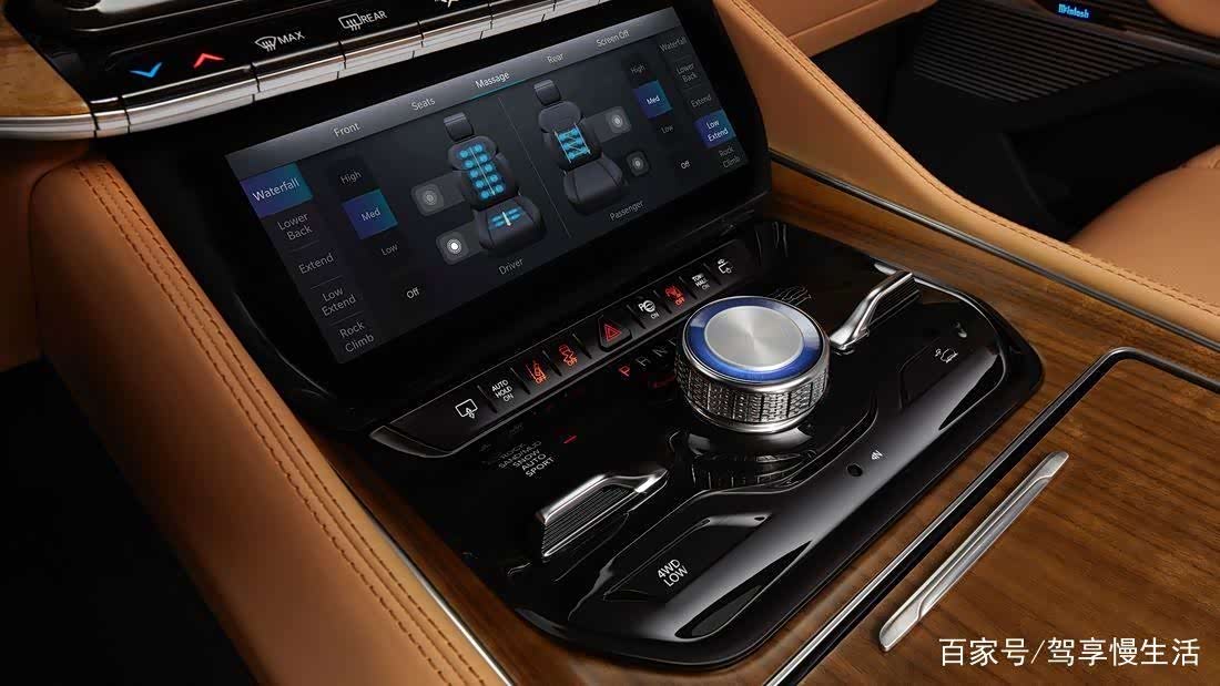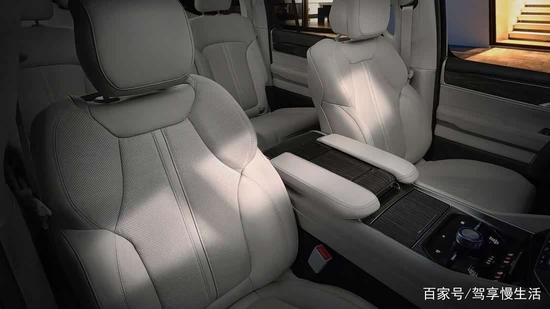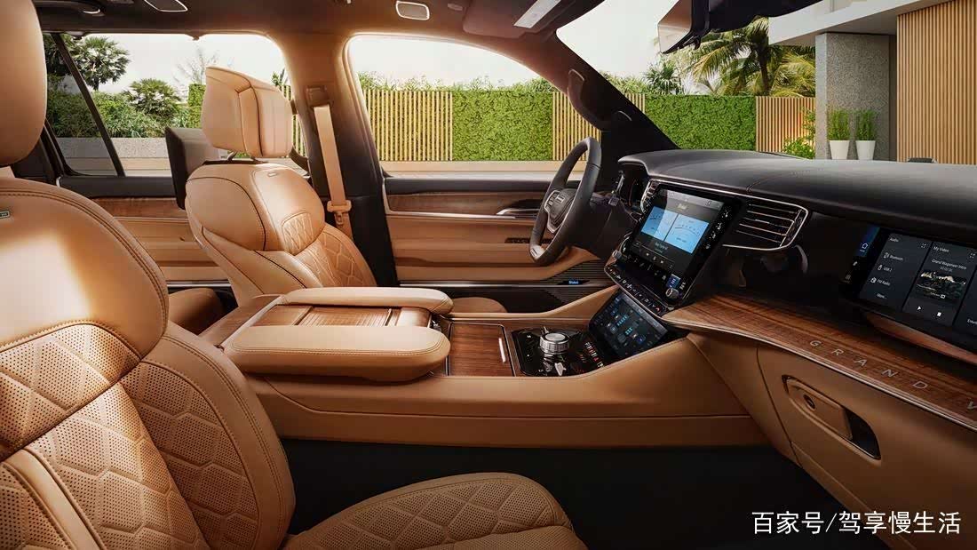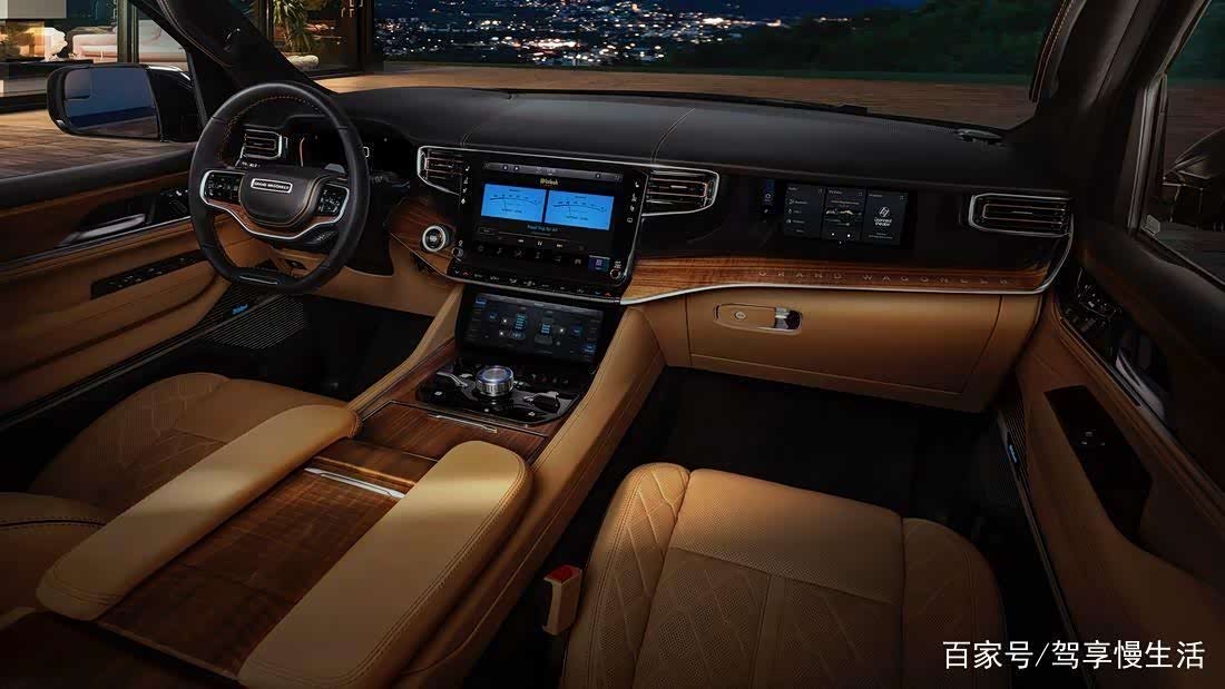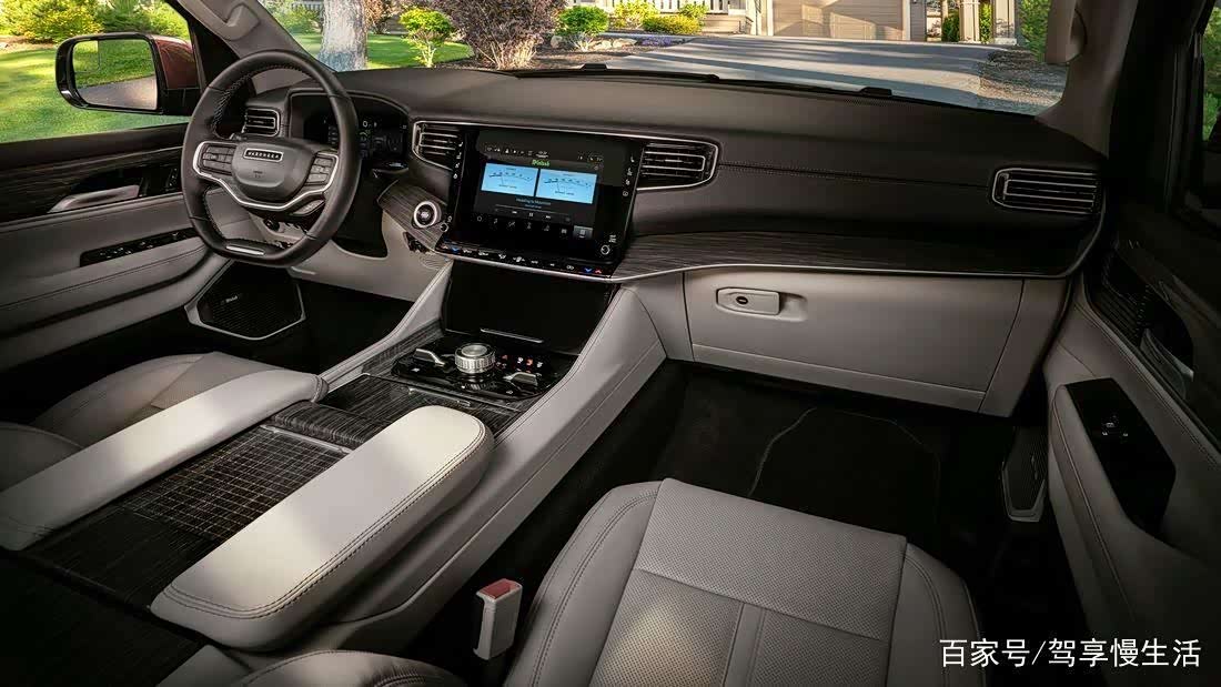 在内饰设计上,Jeep Grand Wagoneer采用了非常豪华的设计,座舱内大量用皮革覆盖,并配备木纹装饰,同时通过全液晶仪表和12英寸中控大屏来凸显科技感,在中控大屏的下方还有可以空调控制屏,副驾驶席前方还有一个10英寸的触摸屏,全车的屏幕均和整个车载信息娱乐系统联网,可以显示包含导航以及视频等多种信息。此外,Jeep Grand Wagoneer高配车型还为第二排和第三排乘客提供了用于控制空调功能的中控大屏,但后排的娱乐系统需要单独付费选装。