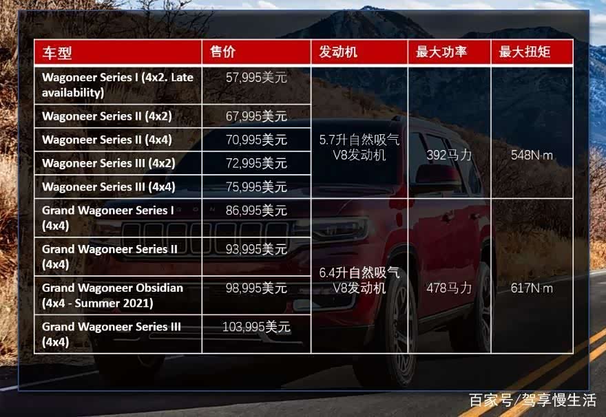 日前,Jeep正式发布了旗下最新的旗舰SUV车型Grand Wagoneer(参数|询价),分别推出了Wagoneer和Grand Wagoneer两种版本九款车型,售价57,995美元(约合人民币37.72万元)-103,995美元(约合人民币64.64万元),分别搭载5.7升自然吸气V8发动机和6.4升自然吸气V8发动机。