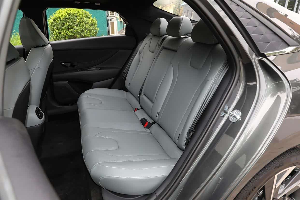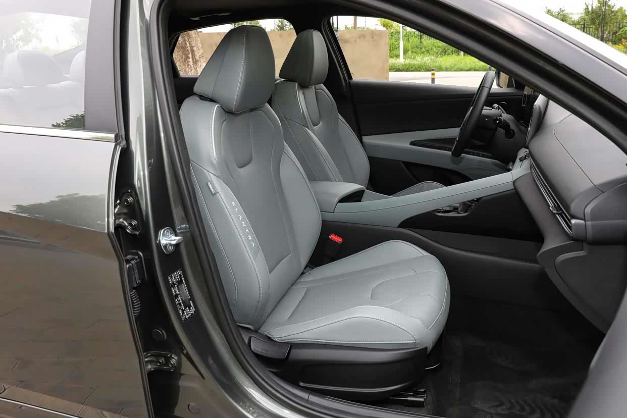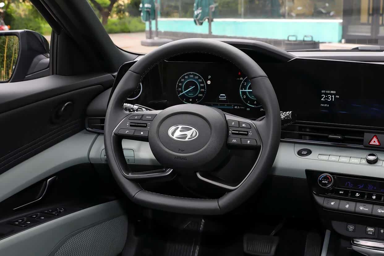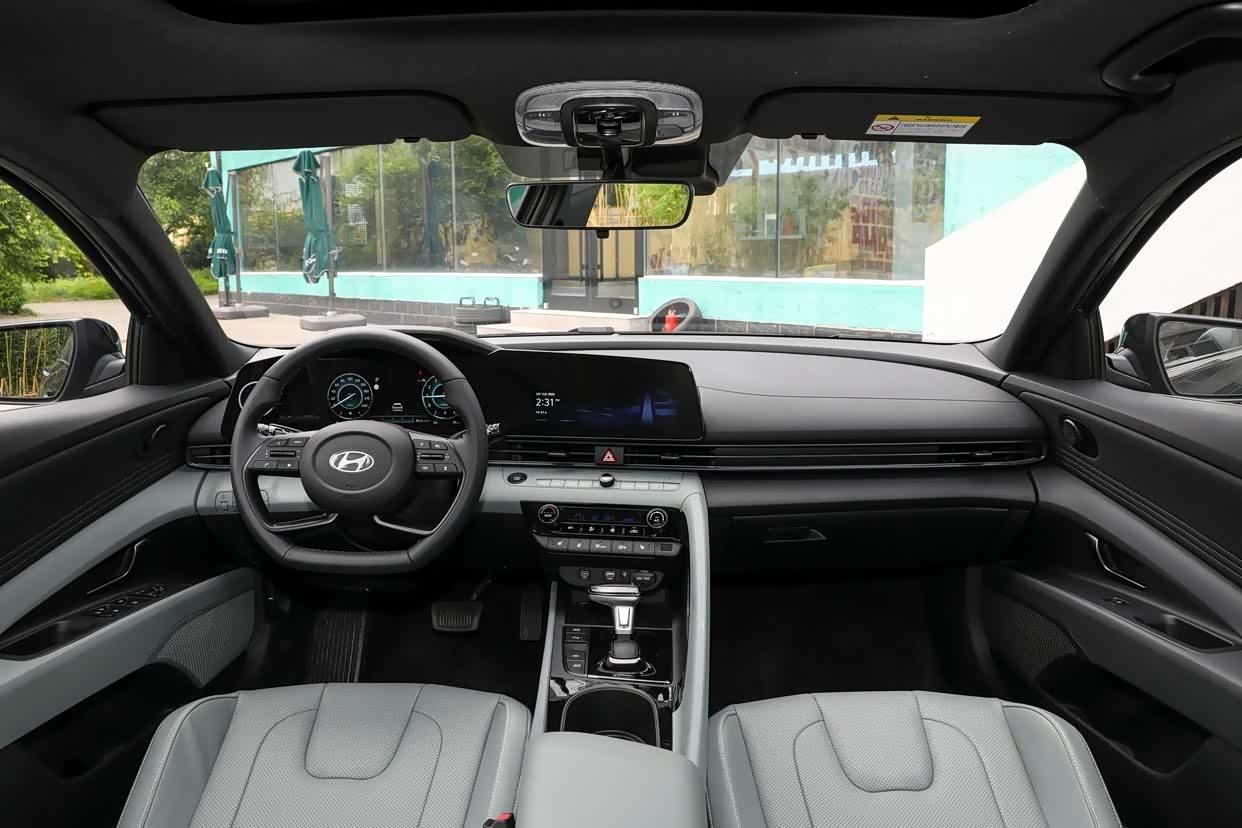 来到车内,可以看出现代伊兰特的内饰融入了时下流行的设计元素,如偏向驾驶员一侧的非对称中控布局,双10.25英寸连体屏幕设计等等。为了营造这种以驾驶者为中心设计的沉浸式座舱,除了中控屏偏角外,在内饰配色上采用包裹式设计。而用料方面,中控台上方也有软质材料覆盖,相比同级车型的缝线处理,视觉效果上档次感稍弱了些。而这个平方方向盘看起来挺运动的,握感还不错,不过只支持上下两向调节。