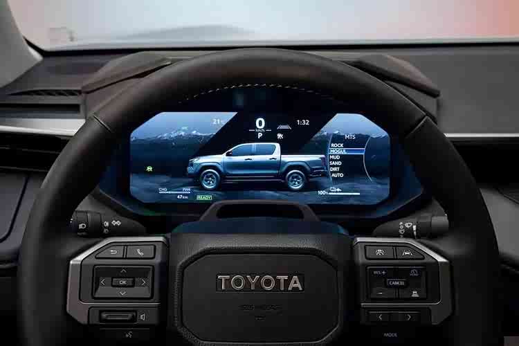 座舱内部经过彻底改造,将现代科技与海拉克斯传统的实用特性完美融合,方正的中控台内嵌独立的12.3寸娱乐资讯系统屏幕和12.3寸全液晶数字仪表板。值得一提的是,空调和音响等重点功能仍保留了实体按键,以确保了操作的便利性。其他内饰亮点还包含了源自兰德酷路泽的多功能方向盘、小巧的换档杆、中控台上的驾驶模式选择系统旋钮、副驾驶双层储物格以及仪表板上的杯架。