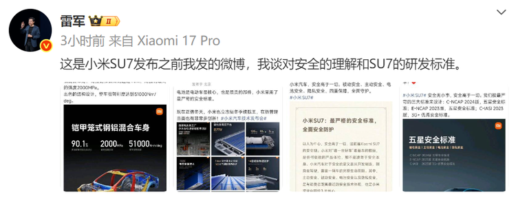 11月16日,小米汽车雷军连发多条微博,重申小米汽车的安全设计理念;有网友断章取义,说小米汽车好看比安全重要,雷军回应称:安全是基础,安全是前提,安全高于一切。