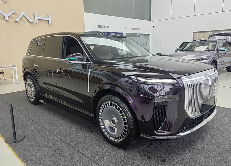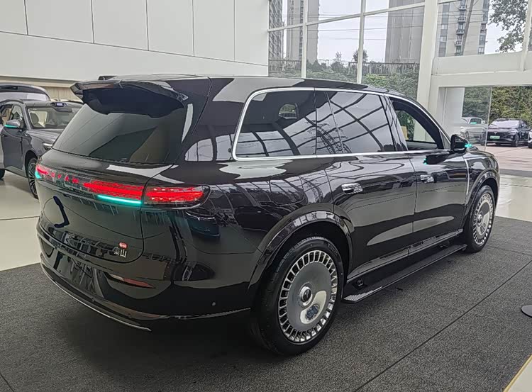 侧面身形魁梧大气,符合全尺寸SUV该有的体量感。窗沿和门把手用镀铭装饰,轮毂是亮色锅盖样式大尺寸设计,精致感不错。尾部高位扰流板加贯穿式尾灯,LED光源丰富,点亮后挺酷炫,呼应前脸科技氛围。整体造型在保持大气的同时,细节处理也挺到位。