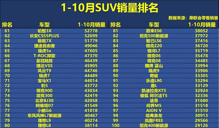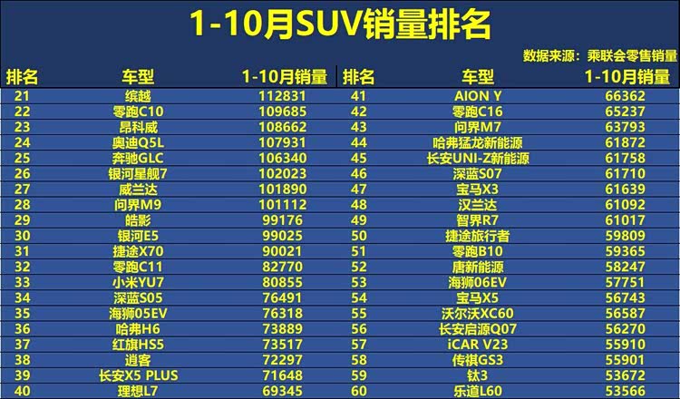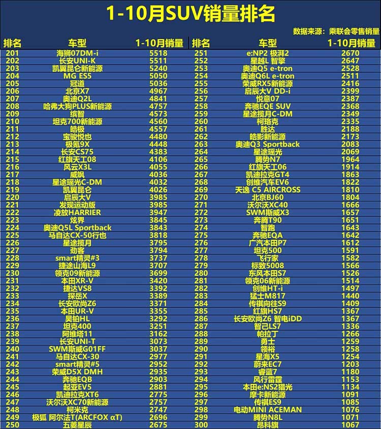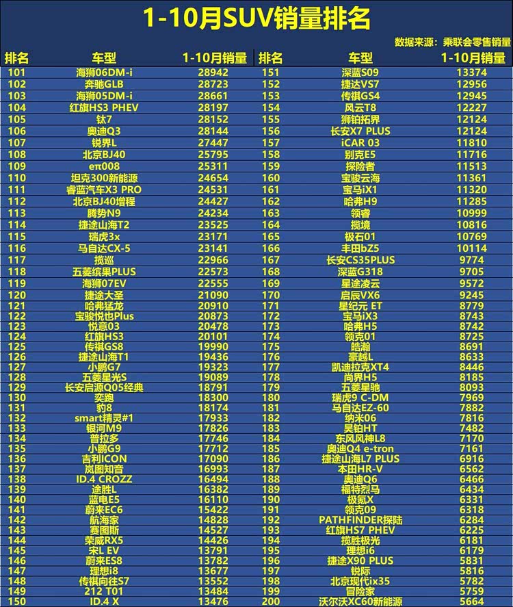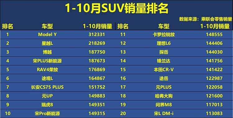 根据最新公布的2025年1-10月SUV零售销量榜单来看,整体格局呈现出明显的分层现象。特斯拉Model Y以超过31万辆的销量稳居榜首,展现出强大的市场号召力;而传统燃油车型如 星越L(参数|询价)、博越等也保持稳定表现,销量均突破18万辆。在中段排名中,一些新兴品牌开始崭露头角,例如零跑C10以近11万辆的销量跻身前列,显示出新能源车型的渗透力逐步增强。跳跃至榜单后半部分,像奥迪Q5L这样的豪华品牌车型销量维持在10万辆级别,而一些定位更细分市场的产品如海狮07DM-i则销量相对较低,仅约5000余辆。值得注意的是,部分经典车型如本田CR-V和哈弗大狗依然保持在中上游位置,但销量与头部阵营存在一定差距。整体来看,SUV市场既有机遇也有挑战,不同价位和定位的车型表现分化明显。又是大胜!1-10月SUV销量榜:国产车前10占7,博越季军,CR-V第15!