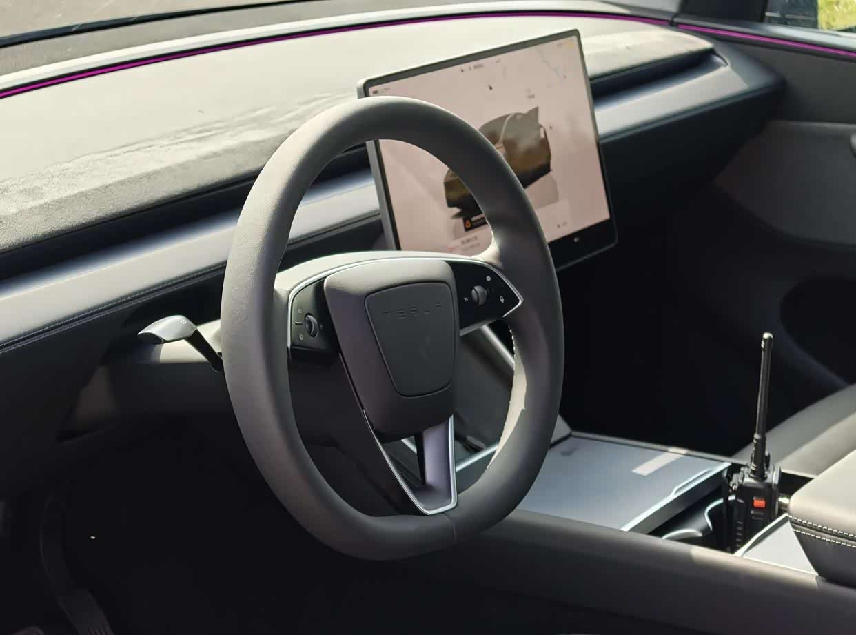 1.回归的转向灯拨杆: 特斯拉听取了用户反馈,在方向盘左侧重新加入了物理转向灯拨杆。虽然设计极简(单挡位),但高频操作时,物理拨杆的直觉性和便利性远超屏幕或方向盘按键。