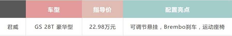 君威GS搭载了一台2.0T发动机,最大功率192KW,峰值扭矩350N·m,匹配9AT变速箱,多家媒体测试零百加速时间能跑到接近6秒。切换到运动模式,车子的转向力度,悬挂阻尼都能进行改变,底盘支撑力十足,指向精准君威GS称得上是最具驾驶乐趣的中级车。