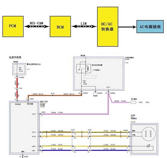 ①逆变器;②逆变器输出插头连接器③车身电脑(BCM)