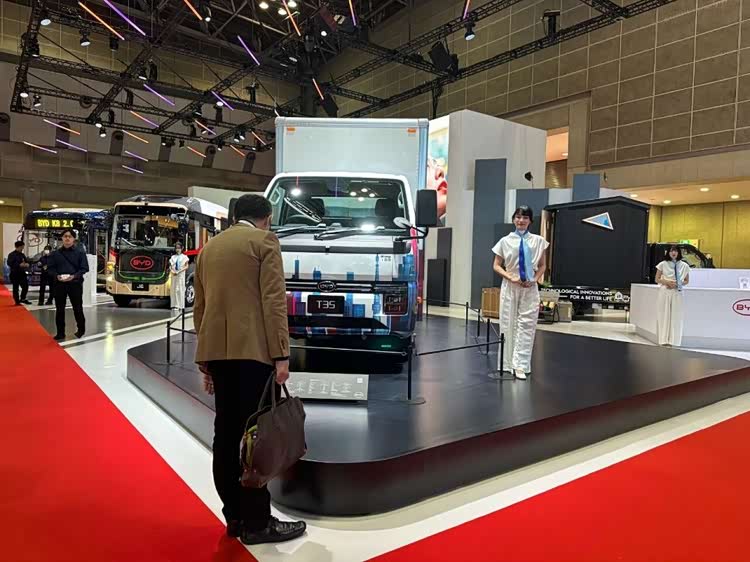 比亚迪此次同时设置了乘用车和商用车两个展台,商用车比亚迪全球首发了纯电卡车T35,小型纯电动巴士J6 living car概念车,并展示了中型纯电动巴士J7,大型纯电动巴士K8。