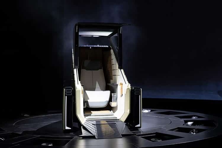 它采用无B柱,两侧「无轨」滑移式车门设计;后排是可一键后仰60°的「航空躺椅」,标配足底加热、隐藏式冰箱与23扬声器雅马哈3D音响。