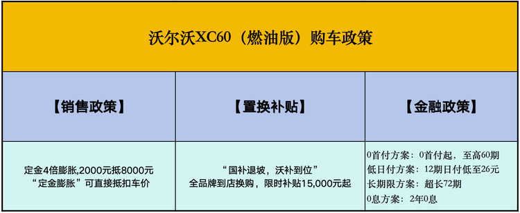 并且新款沃尔沃XC60还推出了多种购车政策,如0首付起至高60期金融方案、12期日付低至26元等等,大大降低了消费者的购车门槛。