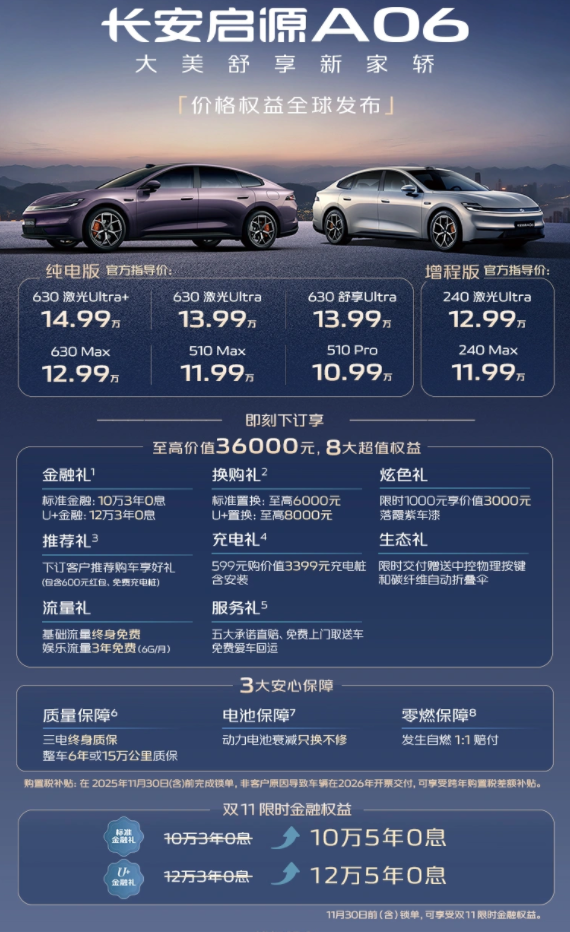 首当其冲的就是大家在购车最关心的权益方面,长安启源提供了至高价值36000元的“8大超值权益”。金融政策是此次权益的核心亮点,标准方案中,630激光Ultra+车型可享至高12万3年0息,其他车型可享至高10万3年0息。而双11限时升级权益更将期限延长至5年。这样的金融政策确实能够降低消费者的购车门槛,特别是对于预算有限的年轻家庭来说具有不小吸引力。