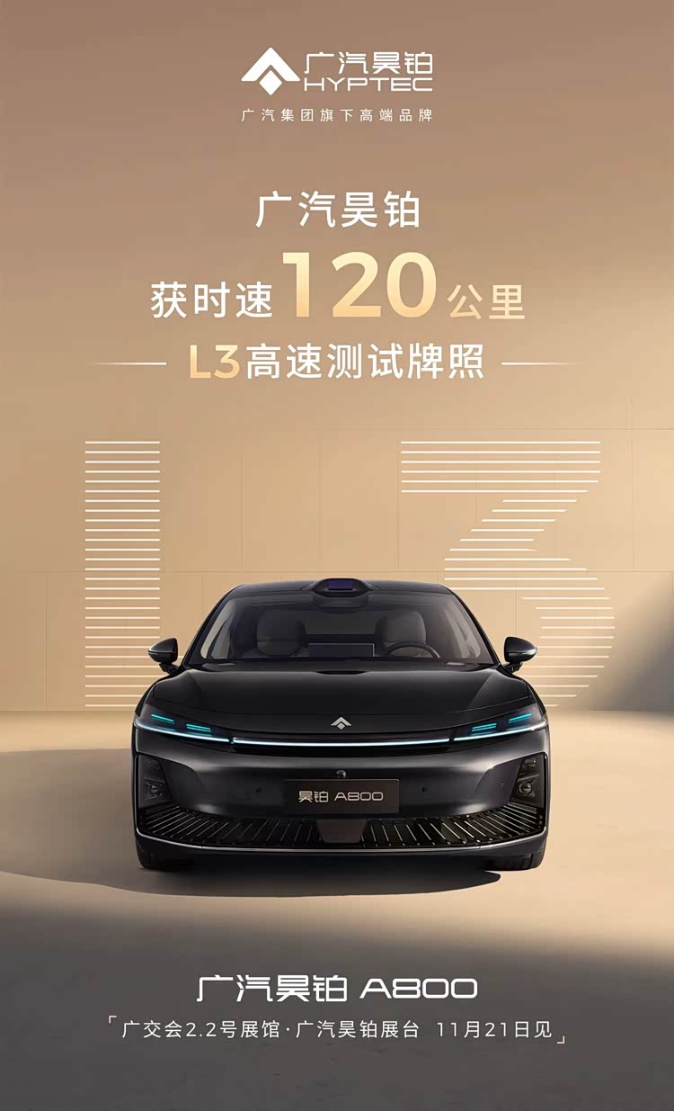 11月21日,搭载L3级自动驾驶技术的广汽昊铂A800,将登陆广州车展2.2馆,敬请期待!