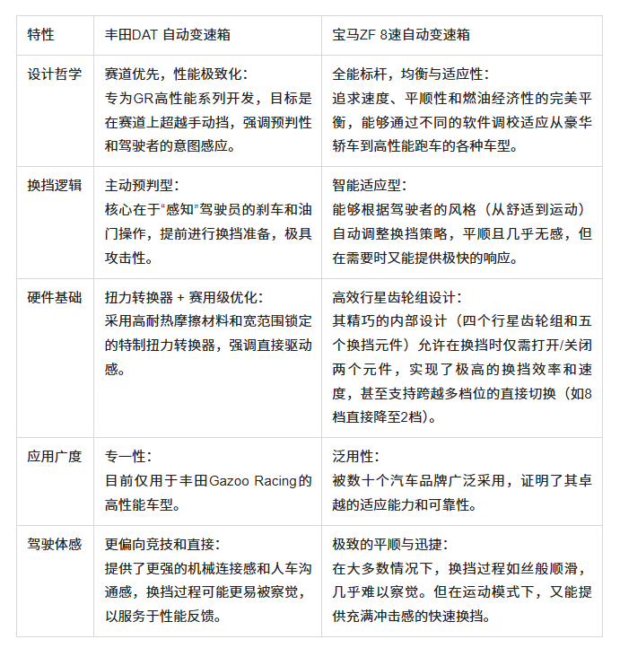 将丰田DAT与被誉为“神级”的宝马ZF 8速变速箱进行比较,可以发现两者在哲学和实现方式上既有共通之处,也存在显著差异。