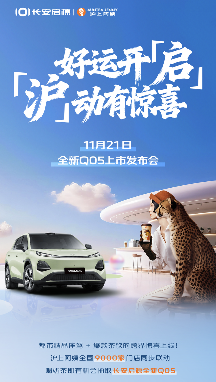 沪上阿姨“百城千店”同步联动:11月20日-11月25日,在全国门店购沪上阿姨奶茶,即有机会抽取长安启源全新Q05的3年使用权。