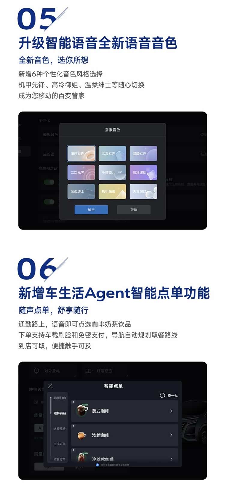 除了让驾驶更安全、轻松,此次OTA在智能交互与生活便利性上也带来了多项全新功能。新增的智能语音全新语音音色,机甲先锋、高冷御姐等6种个性化音色随心切换,满足不同用户的个性化偏好,让语音助手成为移动的百变管家。全新的车生活Agent智能点单功能,让用户在通勤路上即可通过语音轻松点选咖啡奶茶饮品,系统将自动完成下单、支付并规划取餐路线,实现到店即取。