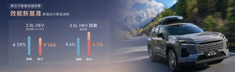 换代威兰达首次新增2.0L混动版本,较上一代2.0L燃油版油耗降低28%,百公里油耗低至4.59L,同级亏电油耗最低,动力输出提升14.3%,不充不换轻松驱动上千公里;2.5L HEV版对比上一代油耗降低6.1%,百公里油耗低至4.91L,动力提升6.8%,最大功率174kW,同级最高。不挑温度,不挑速度,全速域高效率、低油耗、强动力的换代威兰达,轻松满足用户短途长途多种用车需求。
