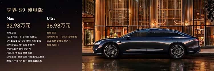 享界S9纯电版Max售价32.98万元,享界S9纯电版Ultra售价36.98万元。