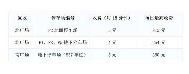 南广场地下停车场:每15分钟收费5元,24小时最高收费限额为360元。