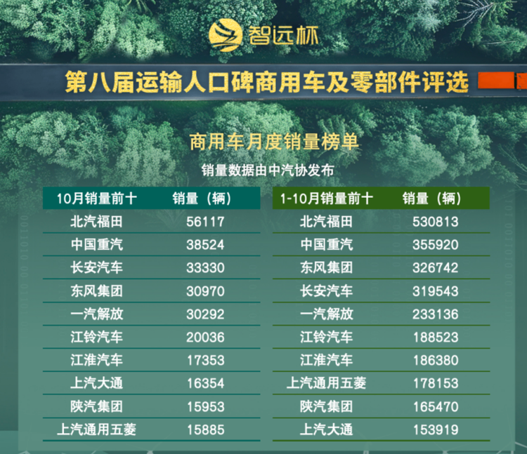 从1至10月的累计销量来看,商用车市场总销量达到347.9万辆,同比增长9%。其中,福田汽车累计销售53.08万辆,继续领跑行业;中国重汽累计销售35.59万辆,位居次席;东风公司与长安汽车分别以32.67万辆和31.95万辆的累计销量分列第三、第四位。