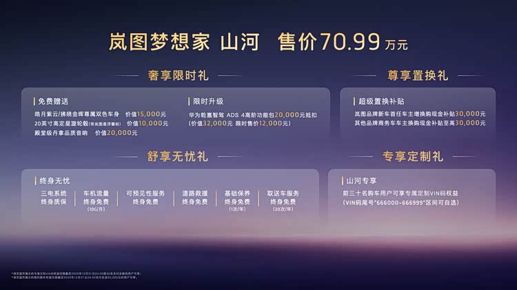 11月21日,广州车展盛大启幕,“新时代旗舰四座MPV”岚图梦想家山河正式上市,售价70.99万元。同步推出山河专属四重礼,包含皓月紫云/拂晓金辉尊属双色车身、20英寸高定星漩轮毂(带岚图悬浮徽标),及殿堂级丹拿品质音响;华为乾崑智驾ADS4高阶功能包现金抵扣;超级置换补贴;专属定制VIN码权益;三电系统终身质保、车机流量终身免费、道路救援终身免费等权益。