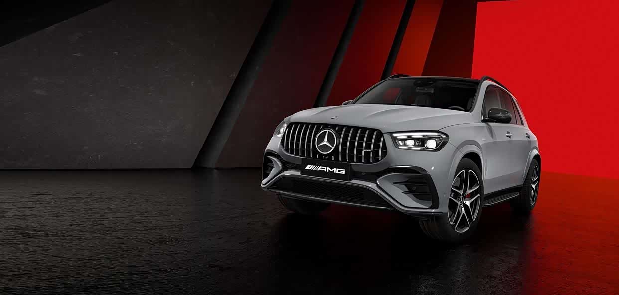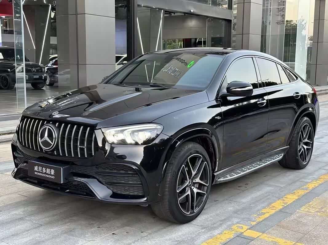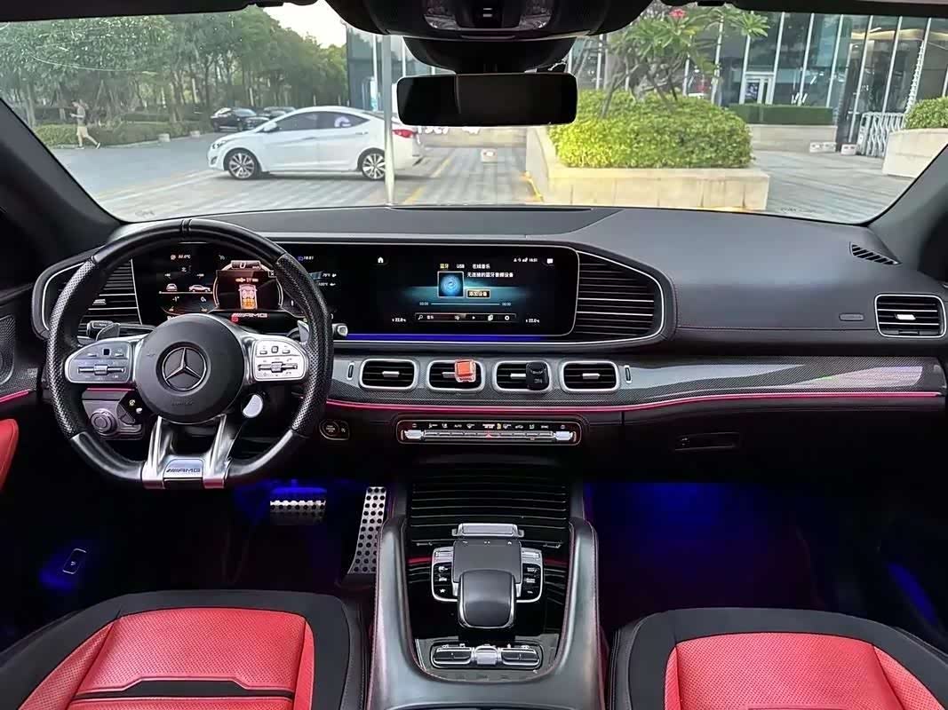 AMG GLE53第一眼绝对是"装逼利器"——直瀑式中网、21英寸大轮毂配红色卡钳、双边四出排气,一看就不是好惹的主。