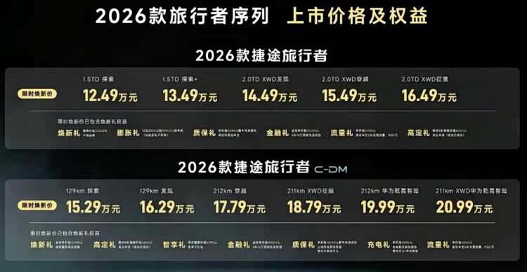 2025广州车展,捷途汽车展台由2026款 捷途旅行者(参数|询价)领衔,现场火爆程度高于BBA,而新车也刚刚在11月17日上市,在老款基础上带来了丰富的升级,且价格同样给力。11款车型,其中燃油版5款车型,限时焕新价12.49-16.49万元;C-DM插混版6款车型,限时焕新价15.29-20.99万元。