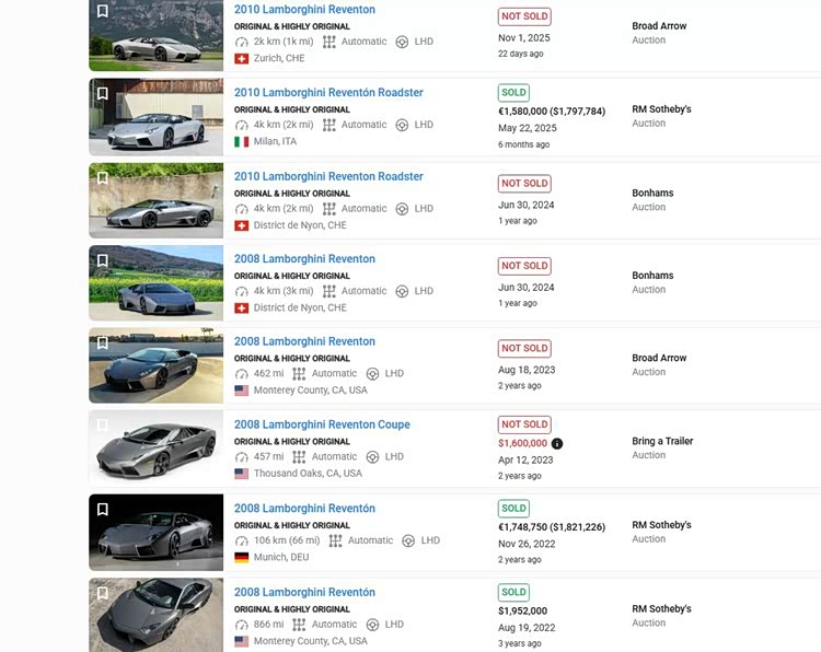由于敞篷版兰博基尼雷文顿(Lamborghini Reventon Roadster)只生产了15辆,所以,这种稀缺豪车通常都会以拍卖的方式出售,RM苏富比曾拍卖一辆,价格为158万欧元,细看二手车汇总的价格,基本在100多万到200万美元之间,而且公里数最高也就4000公里,最低几百公里,天呢,怪不得平时见不到,天天在车库睡大觉。