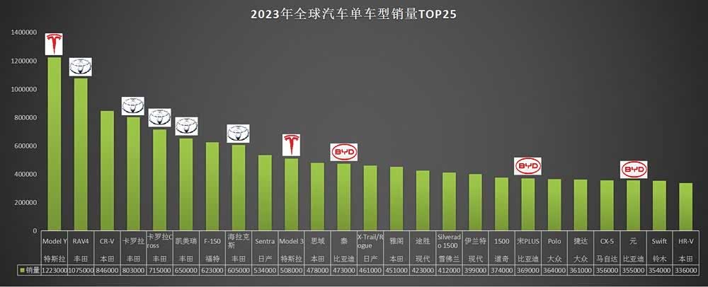相较于2022年,特斯拉Model Y在2023年的销量飙升64%,成功超越了上一年的销售冠军丰田RAV4。丰田RAV4在2023年的销量为107万5千辆,相较2022年下滑了5%。丰田CR-V以84万6千辆的销量位列第三,较去年增长18%。而 丰田卡罗拉(参数|询价)与卡罗拉Cross的销量分别为8万零三千辆和7万壹万五千辆,分别下滑了19%和增长了35%。值得一提的是,得益于比亚迪在全球市场的强劲表现,其全年销量突破百万大关,三款车型成功上榜。其中,比亚迪秦plus销量达4万七十三千辆,排名第12位,同比增长了43%;比亚迪宋PLUS销量达3万六十九千辆,排名第19位,增长幅度为9%;而比亚迪元(国际版名为Atto 3)销量达3万五千五百辆,排名第23位,增长更是高达惊人的119%。