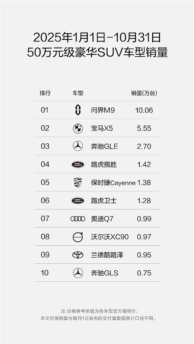 问界M9的“治愈系豪华”,是一场从技术到体验,从身体到心灵的全面革新。而市场,则给予了这场革新最热烈的回响。另据最新行业统计显示,2025年1-10月,问界M9以10.06万辆的惊人成绩,稳居50万元以上豪华SUV销量第一。这一数据,不仅超越了宝马X5的5.55万辆和奔驰GLE的2.70万辆,其领先幅度之大,更成为中国品牌在高端市场扬眉吐气的里程碑。