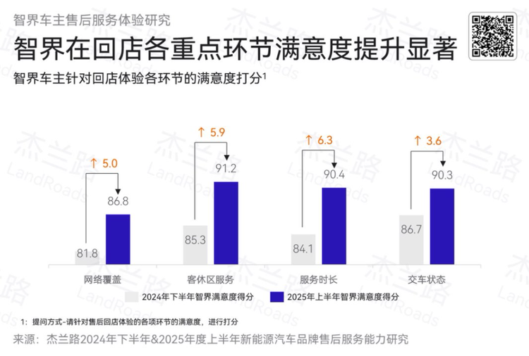 服务体验的升级则进一步提升了用户好感度。品牌2.0阶段引入的鸿蒙智行大饭店服务标准,体验对标一线豪华品牌。完善的服务体系大幅降低了用车顾虑,成为用户主动推荐的重要原因。与此同时,在产品迭代升级过程中,智界始终重视老车主的声音与需求,不仅为老车主提供智能座舱升级服务、4D毫米波雷达硬件升级服务,还推出免费赠送新LOGO和轮毂标活动和迎宾照地灯点亮计划等专属礼遇,以一次次实实在在的升级和福利,兑现“常用常新”的承诺,堪称最“听劝”的品牌。产品与服务的双重保障,让智界积累了极高的用户忠诚度。杰兰路等权威机构调研中售后服务满意度高于行业平均分,受到越来越多年轻人和年轻家庭的喜爱。