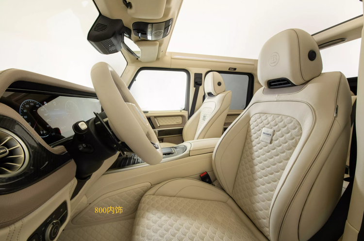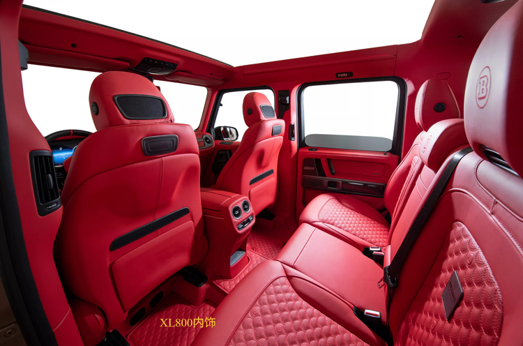 内饰的改造升级更是奢华,车内均采用了定制级别的Masterpiece设计和工艺,除了真皮就是碳纤维,800车型采用了巴博斯顶级的牛津沙色和开罗棕色真皮,XL800车型则采用了巴博斯顶级的红色真皮,内饰均为手工打造,以确保色彩匹配和工艺完美。座椅的头枕处集成了Airscarf颈部暖风系统,可以将暖风随时吹向车主和乘客的头部以及颈部,而座椅的中间部分则采用了“贝壳”绗缝设计,能够将座椅的通风效果达到最佳。除此之外,车内还有大量的碳纤维饰件以及“BRABUS”徽标。