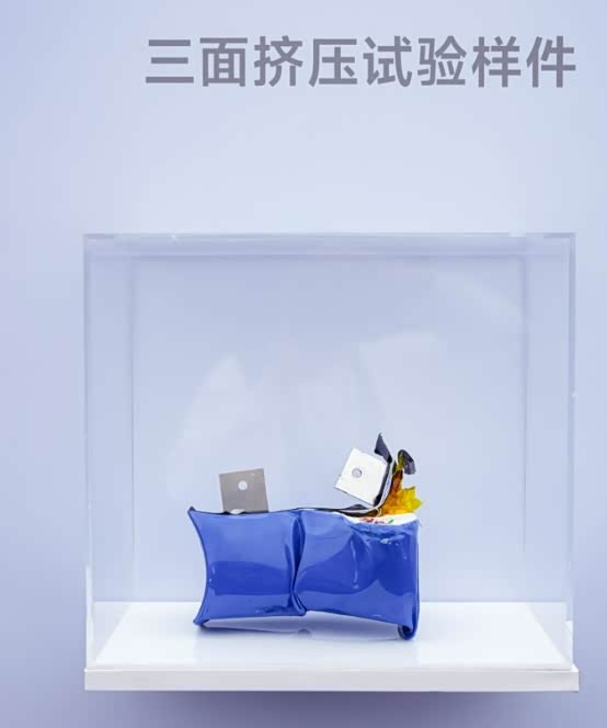 在国标 X 向、Y 向挤压基础上新增 Z 向测试,挤压力提升 150% 至 250kN(相当于 25 吨重量施压)。测试后电池包未出现结构破损与泄漏,既得益于半固态电池包的一体化结构设计,也离不开固态电解质本身更高的机械强度,能有效避免碰撞中电芯短路引发的安全风险。
