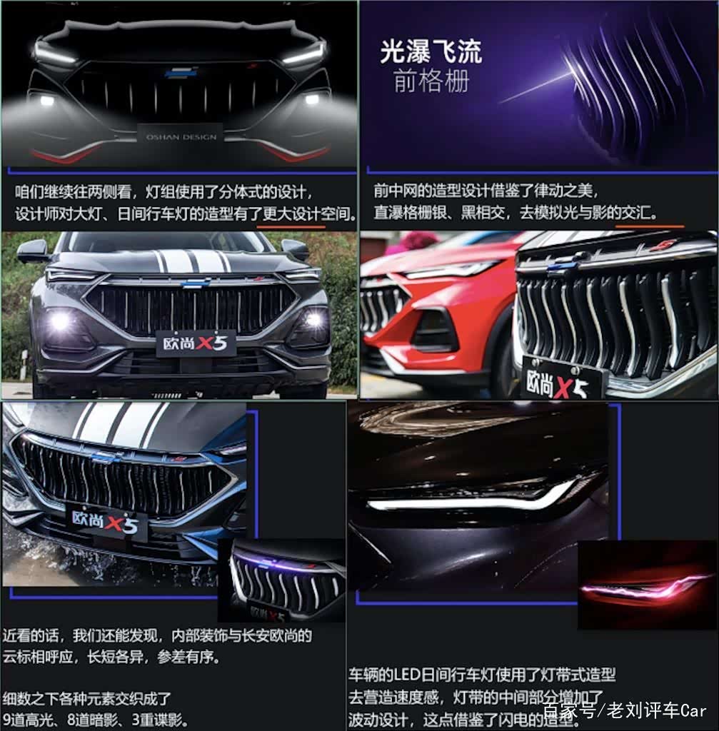长安欧尚X5最大的亮点,就是外观设计更年轻化了,比如有多幅的大轮毂、高高的窗线、很短的前后悬以及很倾斜的尾窗,这些都是运动化SUV非常标准的设计特征。车头部分设计比较用心,前脸上有个六边形的进气格栅,尺寸特别大;格栅顶端有一条银色镀铬饰条用来固定车标的位置;同时向两侧延伸,把日间行车灯处在同样的高度,这样就能锁定消费者的视觉焦点。中网内部是直瀑式的辐条,从侧面看前脸有一种内凹的感觉,即便车子在静止状态下,也会有种流动感;仔细观察发现,它相邻的格栅辐条造型也不一样,由黑色塑料与镀铬装饰条相间,有隔断式的感觉,所以整体来看它的中网设计非常精致。近几年中国品牌出现了很多面向年轻用户的车型,它们在镀铬装饰件上使用得越来越克制,也能反映出现代年轻消费者审美需求的变化。
