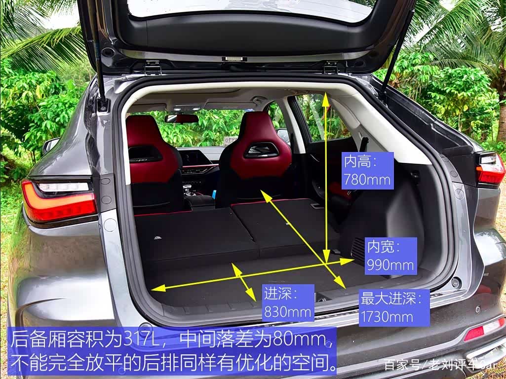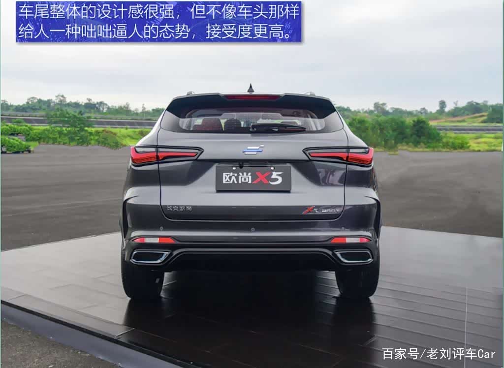 车身侧面的腰线设计很有意思,它的前后灯组都有一条腰线向车中间来延展,并且在中间有个渐变的效果;车门下面有一条腰线向上扬起,整个侧面显得很有立体感;而且三条腰线都是经过了车门之间的缝隙,对于钣金和冲压以及装配工艺都要求比较高,实际看起来缝隙很小、很均匀,并且倒角做的也非常工整,像长安这种国内大厂在这方面的底蕴还是很在线的。长安欧尚X5的车尾如果从正后方来看会呈现出梯形造型,有强烈的宽体感;侧面看车尾是特别倾斜的尾门,显得运动感十足。车尾设计虽然整体没有车头吸引眼球,但是它的简洁感觉以及消费者对它的喜爱程度,甚至比车头更高。