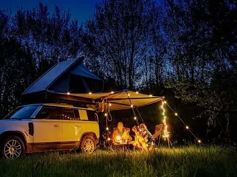 暖黄色的串灯环绕车顶,冷白色的光带贴近底盘,这样的灯光搭配不仅能提升露营氛围,还能彰显你的专业度。