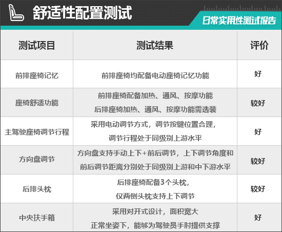 座椅方面,评测车的前排座椅调节按键分别位于座椅左右两侧,位置合理且操作便捷。前排座椅不仅配备电动座椅记忆功能,而且还支持座椅加热、通风、按摩功能,后排座椅加热、通风、按摩功能需要选装才能得到。
