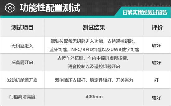 对于消费者来说,门槛离地高度一定程度上决定了上下车便利性。根据实测结果来看,评测车门槛离地高度为400mm,达到同级别车型中游水平,驾乘人员日常上下车较为便捷。