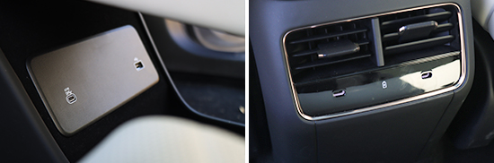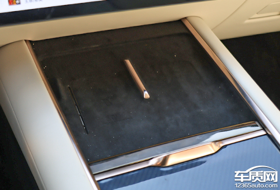 评测车在前排配备了1个手机无线充电板,位置设计合理,拿取手机十分方便。实测充电功率达到50W,侧面还设计有散热口。无线充电板支持开启/关闭功能,通过语音和屏幕内的开关均可进行控制。